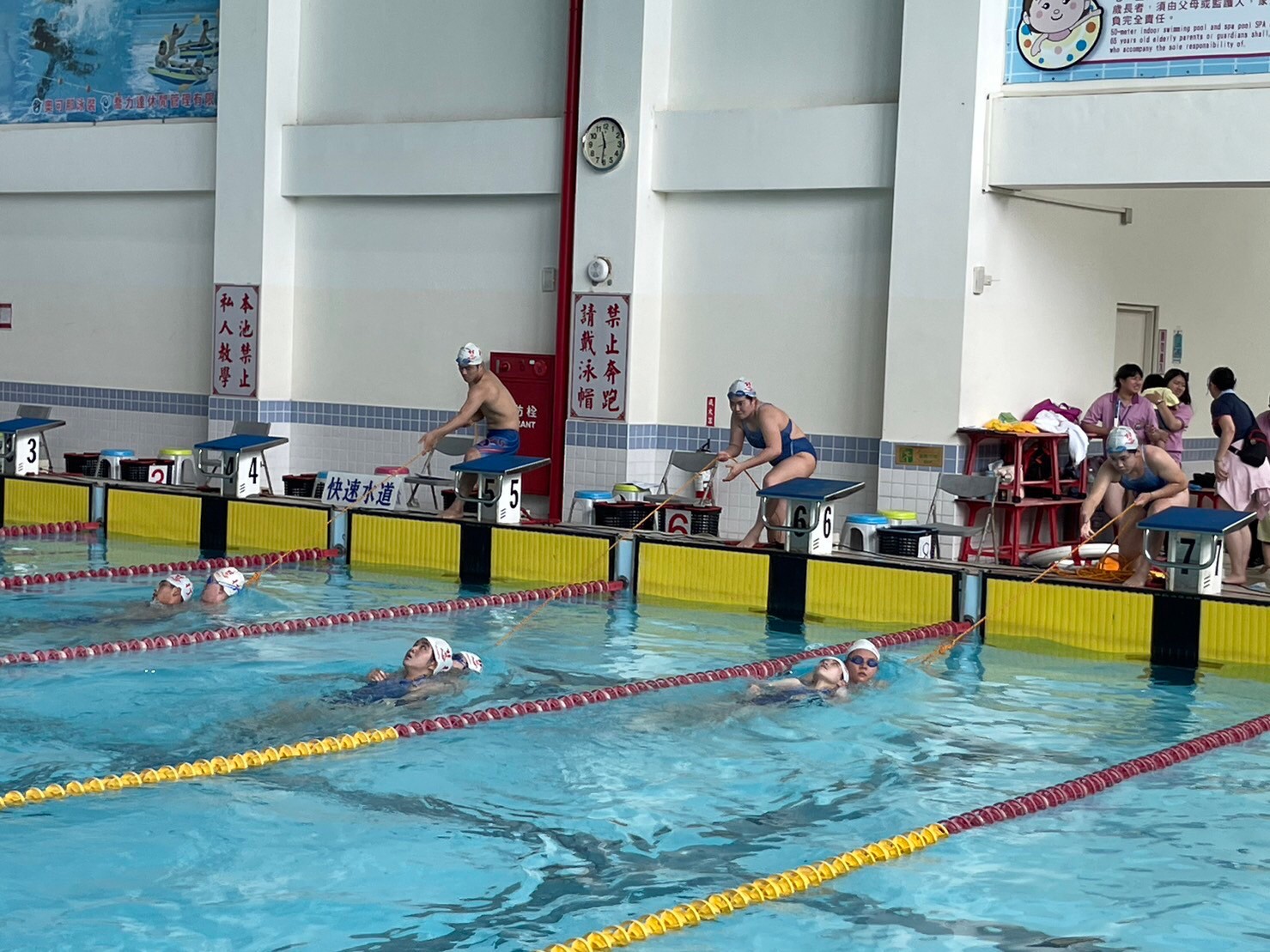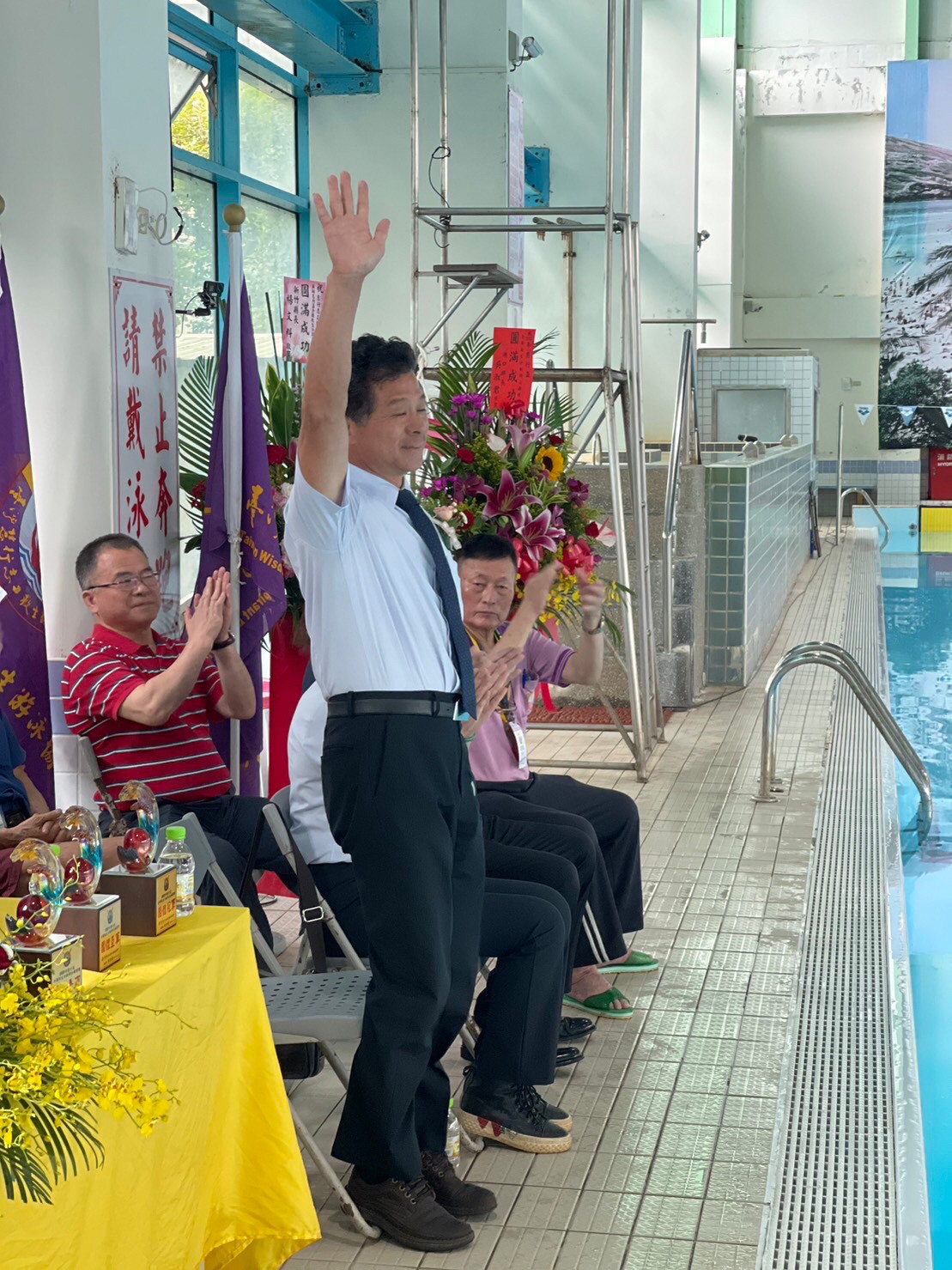 「2023慧行盃全國救生分齡游泳錦標賽」在5月7日(週日),於湖口鄉立游泳池舉辦,更在上午十一點的開幕式中,展現「慧行救生和平小天使」全球獨一無二之「救生示範表演」。本次賽事報名人數共計14隊230人,涵蓋台北、新北、桃園、新竹、台中、雲林、台南、高雄各縣市的隊伍。蒞臨開幕典禮的貴賓有:新竹縣楊文科縣長的代表楊坤海秘書、湖口鄉長的代表呂理光機要秘書、羅美文縣議員、何建樺縣議員的助理、中華民國水上救生協會姜茂勝考試官、中華民國成人游泳協會總會長張文龍賢伉儷、中華民國成人游泳協會桃竹苗區會長蘇冠潔賢伉儷、台中縣四季早泳潛水協會蔡明祥會長、雲林縣水上救生協會林麗鳳理事長、桃園市高中小學家長會長協會楊梅分會總會長古振豐先生、桃園市楊梅區上湖里愛鄉藝文協會張花樑理事長等,張文龍總會長賢伉儷更捐助1萬元贊助活動經費,以及黃世杰立委贊助12箱礦泉水、新竹縣甄克堅縣議員贊助五箱礦泉水、五箱運動飲料,桃園市中壢區龍昌里戎政成里長贊助3千元,在在顯示社會各界對國內推動救生教育的重視。 |