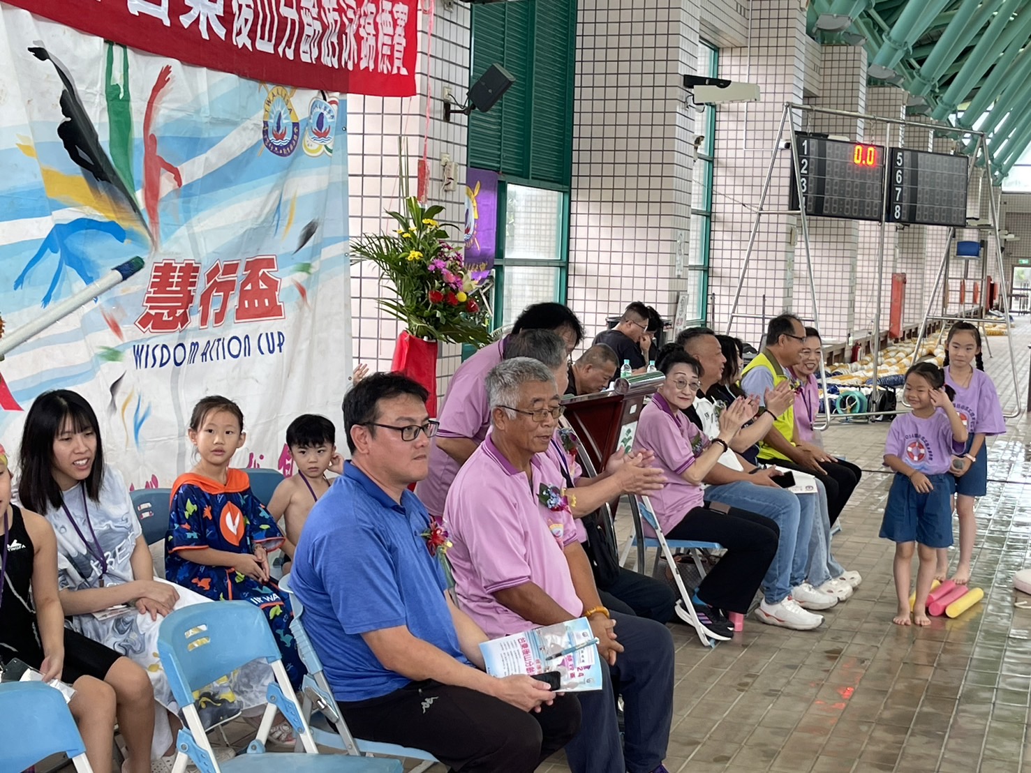 楊淑而主任還表示,慧行盃的特色,除了設立全國泳賽獨一無二的進步獎,特別感謝佑穎營造有限公司張小玲董事長捐贈320條涼感毛巾、以及沉默是金開發企業有限公司總經理捐贈120盒饅頭當進步獎的獎品。另外也感謝已結識十餘年的香港天空泳隊黃子希教練,由香港前來台東慧行盃泳賽,擔任計時兼轉身裁判支援賽事。特別的是在每一場賽事的開幕典禮中,更有難得一見的一群12歲左右的救生小天使們操演的救生示範表演,因為全民救生教育是21世紀的主流趨勢,該協會在全國各地舉辦的游泳競賽場合,場場皆有救生小天使的救生示範表演。