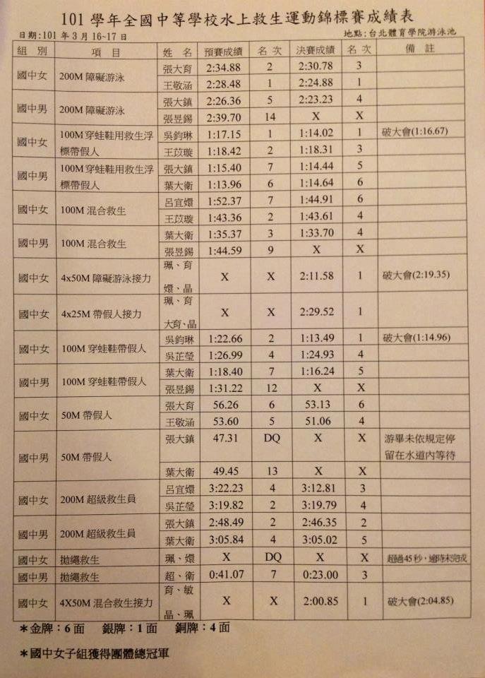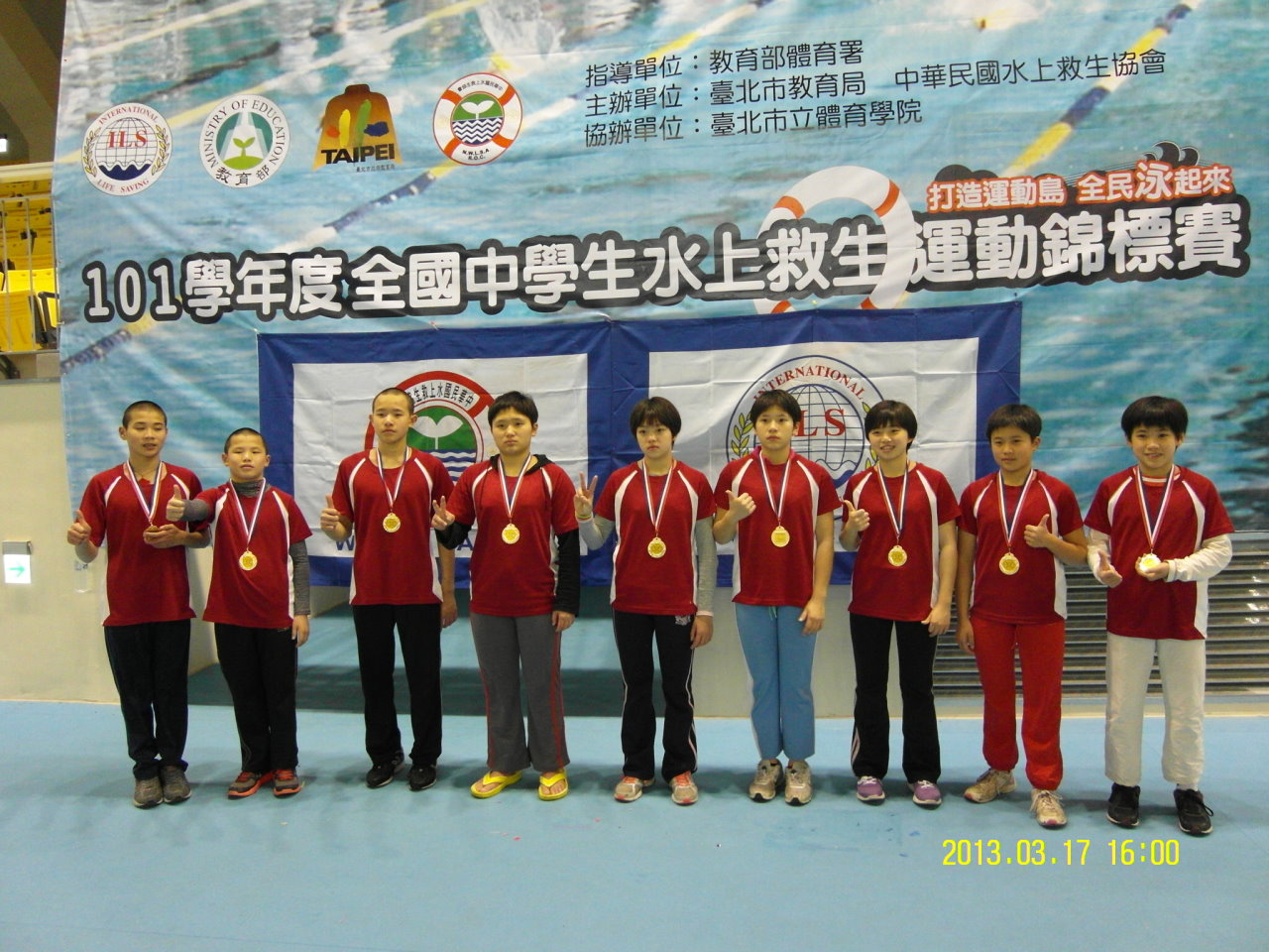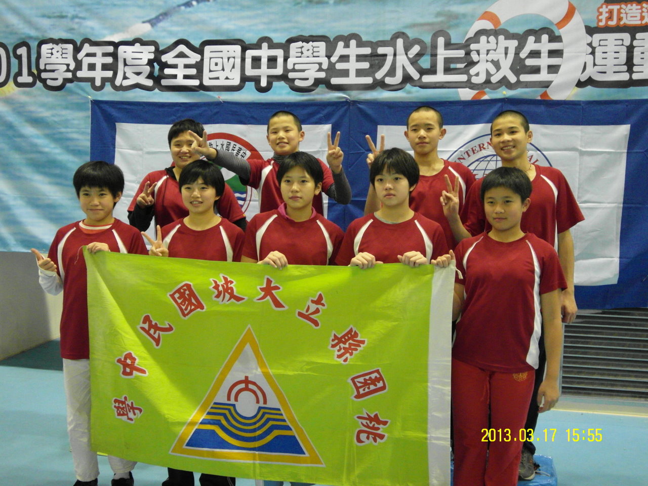 慧行小志工代表大坡國中參加 教育部主辦之101學年度全國中學生水上救生運動錦標賽 勇奪國中女子組冠軍(積分98分,遠勝第二名積分54分), 並打破四項全國紀錄: (1) 100公尺穿蛙帶假人(吳鈞琳) (2) 100公尺穿蛙鞋用救生浮標帶假人(吳鈞琳) (3) 4X50公尺障礙游泳接力(王以璇、王敬涵、呂宜嬛、吳鈞琳) (4) 4X50公尺混合救生接力(王以璇、王敬涵、吳芷瑩、吳鈞琳) 除以上四面金牌之外, 尚有200公尺障礙游泳、4X25M帶假人接力亦獲得金牌, 全部比賽共計比十種項目,慧行小志工國中女子組就獲得六面金牌; 且本次比賽共計比三項接力賽,慧行小志工國中女子組一口氣囊括此三項接力賽之冠軍, 實力之堅強,技驚全場! 他們靠的不只是「泳技」, 更有一股「以救生為己任」的使命感在心頭! 到底國家需要什麼樣的主人翁, 讓我們一起來栽培慧行小志工!