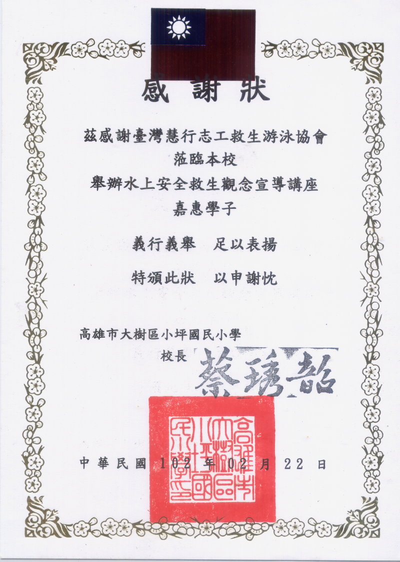 2011年10月獲頒桃園縣消防局水域救援防溺駐守感謝狀