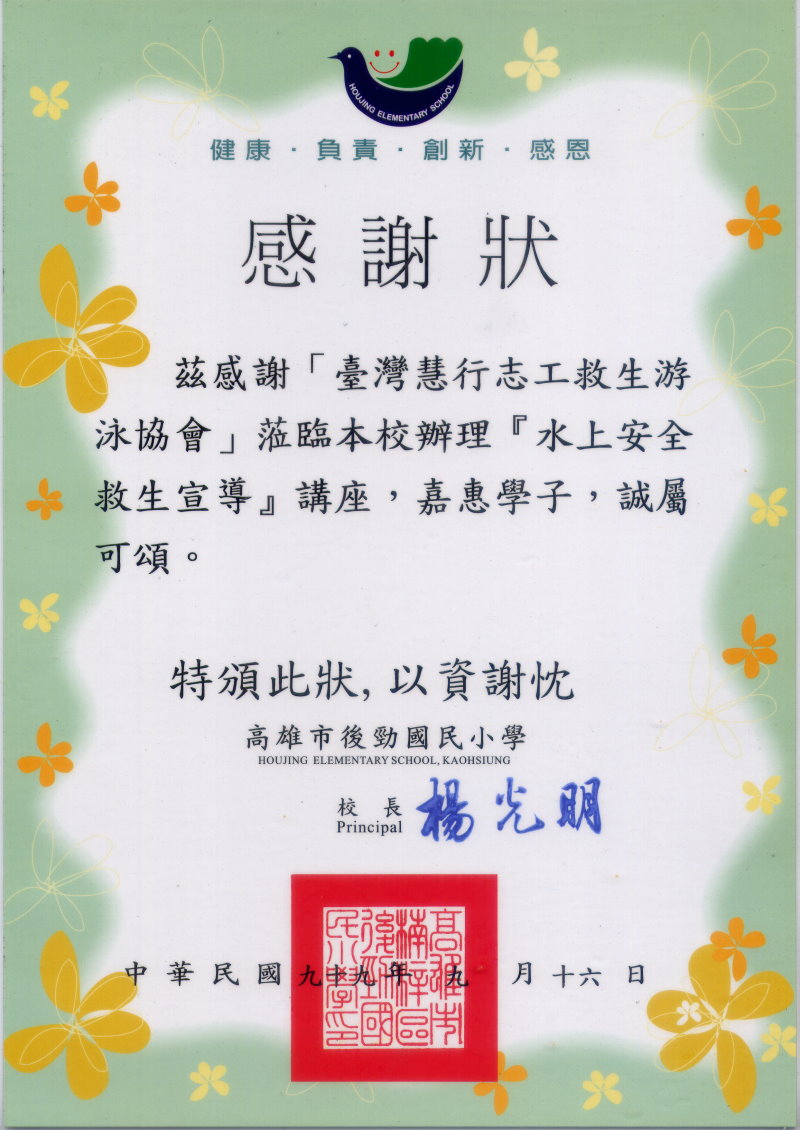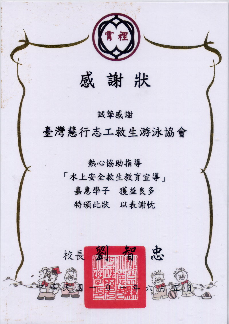 2009年10月獲頒桃園縣永安海域防溺宣導及駐站感謝狀