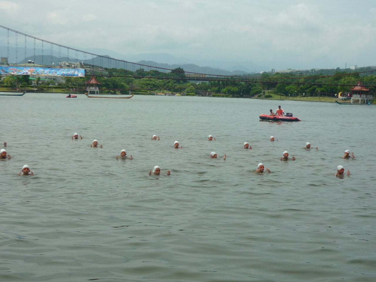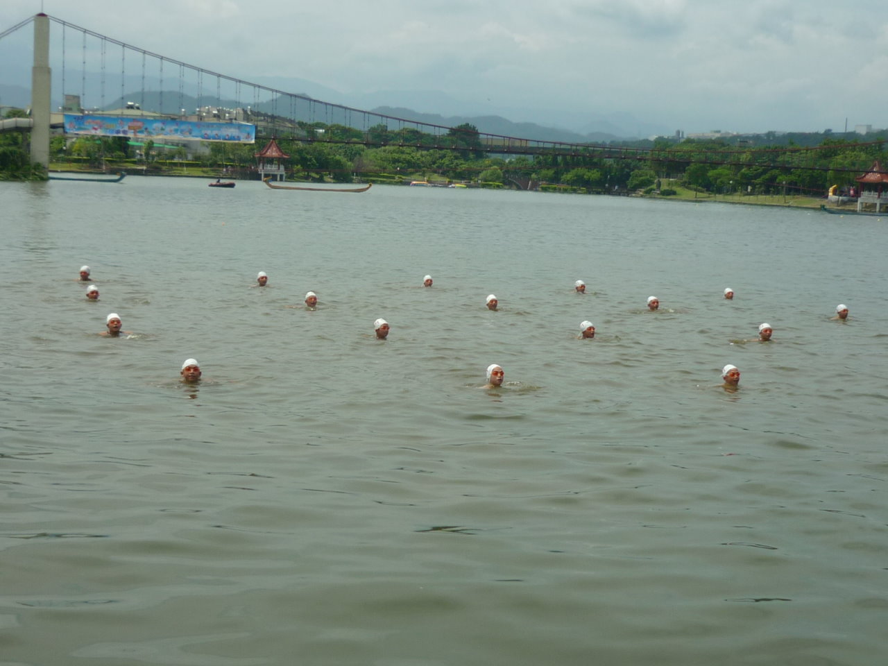 生小天使們在龍潭大池裡,全程以踩水的方式表演各種自救法。
